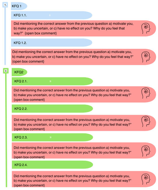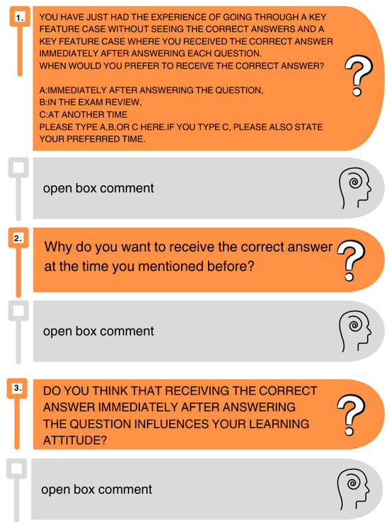 In the third study arm (WS 23/24), the additional research component included two KFQs with sub-questions (1.1, 1.2, 2.1, 2.2, 2.3, and 2.4). Participants were divided into two groups: Group A (n = 44) and Group B (n = 54). Following the completion of one of the KFQs, the participants received FF. At the conclusion of the research component, the students were asked about their preferred timing for feedback and whether they believed the FF would influence their learning attitude (Figure 3).