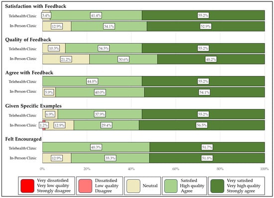 Overall, participants positively perceived the feedback they received during all clinic sessions. Eighty-nine percent of all clinic sessions left participants feeling ‘satisfied’ or ‘highly satisfied’ with feedback, and 81.6% of all clinic sessions included ‘high quality’ or ‘very high quality’ feedback. When comparing the two clinic settings (in-person versus telehealth clinic sessions), there was no statistically significant difference in satisfaction with this feedback (p = 0.5) or perceived quality of feedback (p = 0.3; see Figure 2). Regardless of the setting, most participants strongly agreed with the feedback they received (p = 0.7). Additionally, most participants strongly agreed that they were given specific examples of how to improve (p = 0.8) and felt encouraged by the feedback they received (p = 0.6).