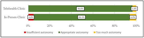 Most participants felt they were given appropriate autonomy in both the telehealth (96.6%) and the in-person clinic settings (89.3%; p = 0.3; see Figure 3). No participants reported insufficient autonomy during the telehealth clinic, whereas 4.8% of in-person clinic sessions were reported to involve not enough autonomy.