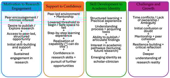 A logic model was developed to visualise proposed pathways between peer-led engagement and academic identity formation (Figure 1). Thematic analysis identified four developmental pathways: (1) Motivation to Research Engagement via peer support; (2) Support to Confidence through guided practice; (3) Skill Development to Academic Identity; and (4) Challenges and Growth.