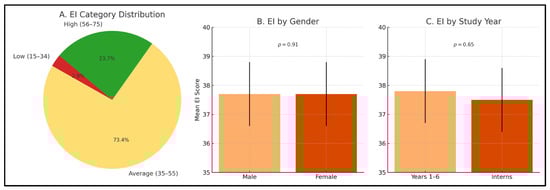 - Abdelmohsen, S.R.; Khired, Z.A.; El-Ma’doul, A.S.; Barakat, A.M.; Kasemy, Z.A. Emotional Intelligence and Academic Performance Among Egyptian and Saudi Arabian Undergraduate Medical Students: A Cross Sectional Study. Res. Sq. 2021. [Google Scholar] [CrossRef]