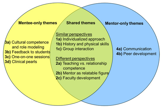 Figure 1 presents a schematic of the relationship of themes comparing mentors’ and mentees’ responses. Three categories of “similarities” were discussed similarly by both mentors and mentees. Although there were some minor differences between mentors and mentees in the three “similarities” categories, their content and importance were very similar. Three categories of “differences” were discussed by both mentors and mentees but with different perspectives. And lastly, four themes were unique to mentees, and two themes were unique to mentors.