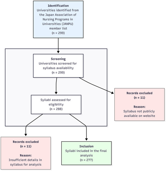 Figure 1 illustrates the flow of syllabus selection for this study. A total of 299 universities were initially identified from the JANPU member list. Through the screening process, 11 universities were excluded because their syllabi were not publicly available on their websites, leaving 288 syllabi for eligibility assessment. Of these, a further 11 syllabi were excluded due to insufficient detail regarding course content. This resulted in a final sample of 277 syllabi being included in the analysis.