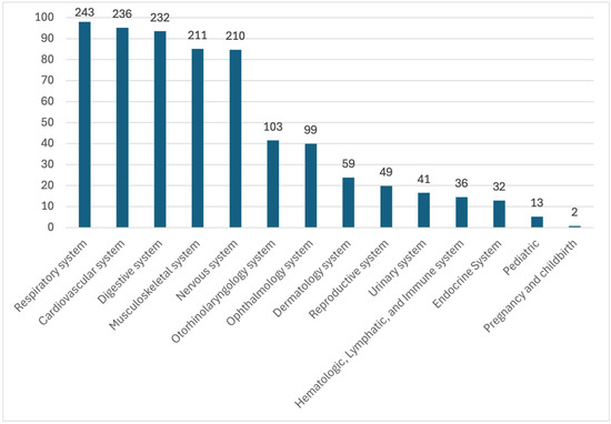 The implementation rates for each body system among the 248 universities adopting the Body System Approach are detailed in Table 2 and visually presented in Figure 2. The specific implementation rates were as follows: respiratory system: 243 (98.0%), cardiovascular system: 236 (95.2%), digestive system: 232 (93.5%), musculoskeletal system: 211 (85.1%), nervous system: 210 (84.7%), otorhinolaryngology system: 103 (41.5%), ophthalmology system: 99 (39.9%), dermatology system: 59 (23.8%), reproductive system: 49 (19.8%), urinary system: 41 (16.5%), hematologic, lymphatic, and immune system: 36 (14.5%), endocrine system: 32 (12.9%), pediatric: 13 (5.2%), and pregnancy and childbirth: 2 (0.8%).