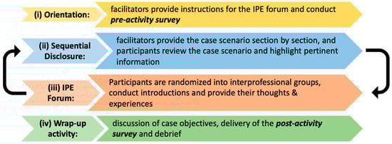The format of the session was a four-step method of (i) Orientation: facilitators provide instructions for the IPE forum and conduct pre-activity survey; (ii) Sequential Disclosure: Facilitators provide the case scenario section by section, and participants review the case scenario and highlight pertinent information; (iii) IPE Forum: Participants are randomized into interprofessional groups and conduct introductions and provide their thoughts and experiences, throughout the sequential disclosures of the cases.; (iv) Wrap-up activity: Discussion of case objectives, delivery of the post activity survey and debrief (Figure 1). The Nova Southeastern University (NSU) Interprofessional Day (IPE Day) event was held virtually via the Zoom videoconferencing platform. The one-hour interprofessional case-based learning sequential disclosure activity (IP-CBL-SDA), was conducted virtually and hosted on the Zoom videoconferencing platform. The presenters used a PowerPoint slide set to deliver the clinical vignette to students in parts. Learners volunteered to read the sections of the case vignette aloud while the other participants followed along. Following each section of the case vignette, prompt questions were displayed for group discussion. Clinical and basic science faculty researchers facilitated the group discussions, asking guiding question and soliciting participant responses. The facilitators maintained a welcoming and safe environment to encourage participant expression of their unique views within the group discussion. Anonymous pre-and post-activity surveys were administered to learners who chose to participate in the study. The surveys were delivered using Microsoft Forms via hyperlink and a displayed QR code. The overall format was adapted from previously published methodology [16].