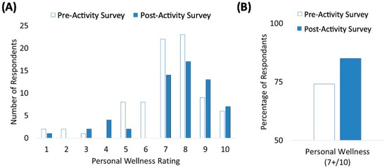 Participant-Reported Improvement in Personal Wellness. (A) Participants rated an improvement in their personal wellness with an increase in the distribution of higher personal wellness rankings among the pre-activity survey and the post-activity survey; (B) Increased rating of individual personal wellness with 74% of respondents rated their wellness at or above 7 out of 10 before the session increasing to 85% of respondents by the end of the session, (n = 81).