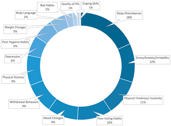 Learner identified prominent signs of struggling with wellness. Representation of common qualitative responses of the pre-activity survey (n = 240, input responses) to the following prompt: P11: What are the 3 most prominent signs or symptoms you might notice in someone struggling with their wellness? (e.g., sleep disturbances, etc.) Participants responded with free-text input responses. The frequency of identical/ similar meaning words as a percent of total input responses.
