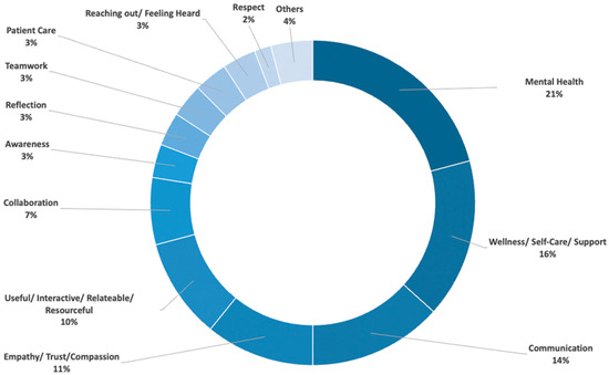The post-activity survey prompt on takeaways had the responses of: Mental Health (21%), Wellness/Self-Care/Support (16%) and Communication (14%) being the top responses (Figure 4). Other key takeaways that learners identified from the session were Empathy/Trust/Compassion (11%), Useful/Interactive/Relatable/Resourceful (10%), Collaboration/Teamwork (10%), Awareness/Reflection (6%), Patient Care (3%), Reaching out/feeling heard (3%), Respect (2%), among other less frequently reported topics (Figure 5).