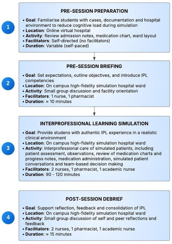 The interprofessional activity took place in a high-fidelity simulated hospital and health service. Situated across one metropolitan and two regional university campuses, this purpose-built facility is designed to replicate a wide range of hospital and community healthcare settings. The facility within the metropolitan campus where the IPL activity took place comprised seven distinct clinical areas across three levels. These included specialised spaces such as medical, surgical, paediatric, emergency, critical care, and recovery units, as well as a community clinic and home-care environment. Additional functional spaces, including clean and dirty utility rooms, helped sustain the authenticity of the simulated environment [29].