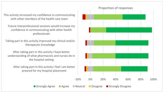 Students’ responses (n = 44) to a series of Likert-scale statements evaluating the impact of the pharmacy and nursing interprofessional learning activity. The x-axis represents the distribution of responses, with neutral responses centred around zero. Bars extending to the right of zero indicate positive responses (Agree, Strongly Agree), while bars to the left represent negative responses (Disagree, Strongly Disagree).