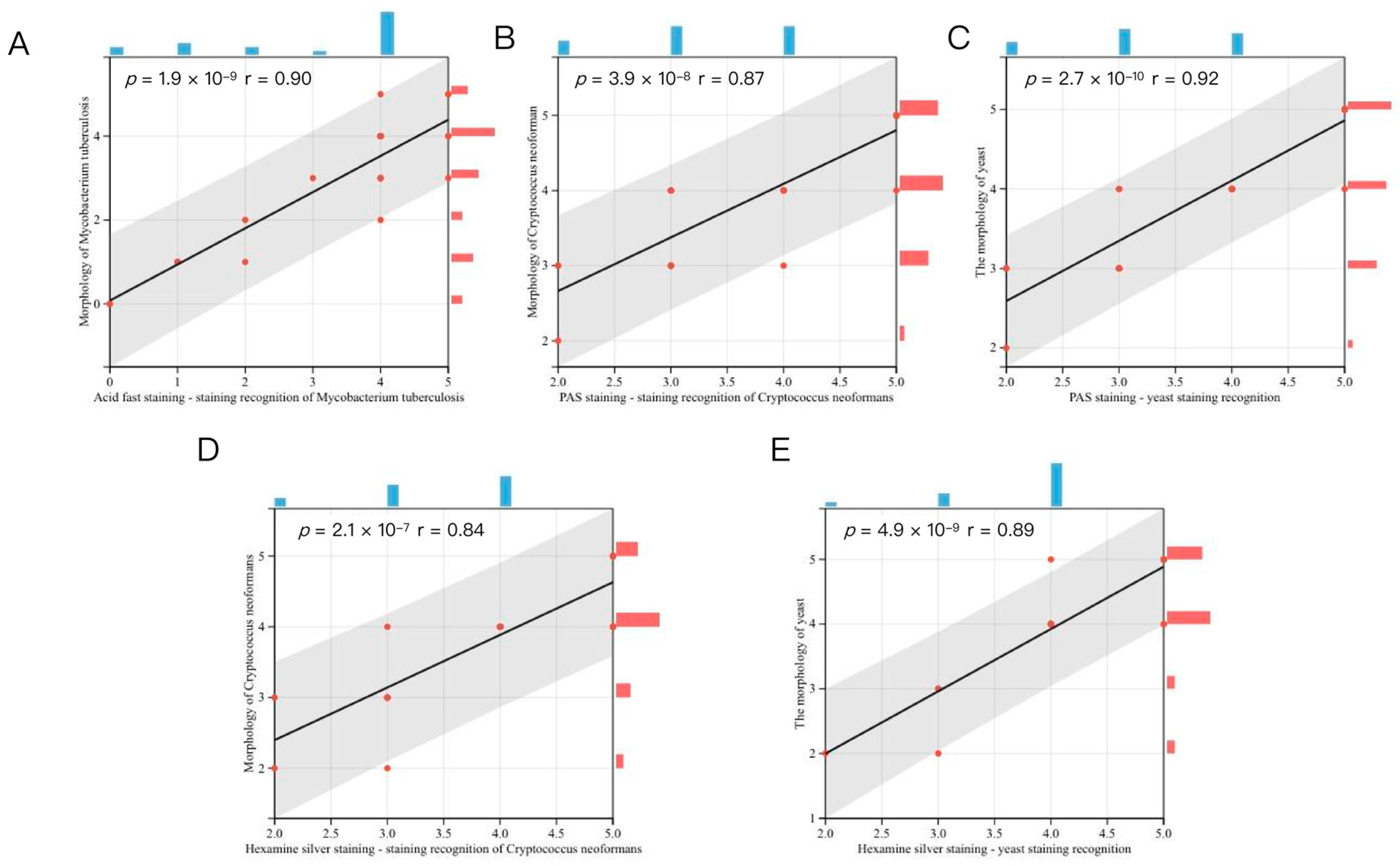 Our analysis revealed a strong correlation between students’ diagnostic confidence in identifying staining results and their morphological recognition proficiency when analyzing acid-fast staining of