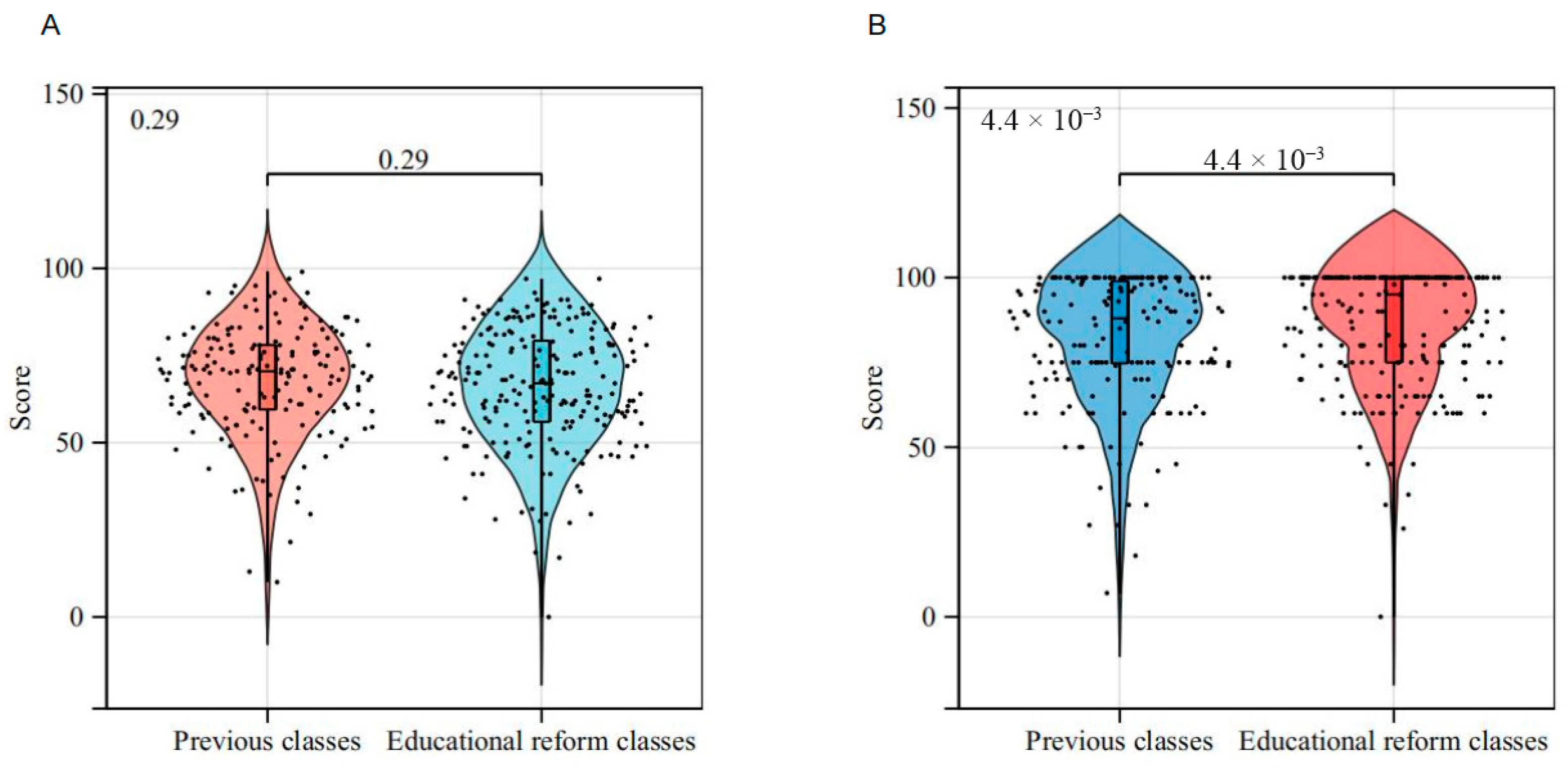 Classes with the educational reform included Basic Medicine (Strong Foundation Plan Experimental Class), Preventive Medicine (Five-Year Program), Preventive Medicine (Bachelor’s, Master’s, and Doctoral Experimental Classes), and Medical Laboratory Technology (Four-Year Program), all of which included 227 students. The classes without educational reform were the previous grade and enrolled 180 students. The pre-reform (control) cohort comprised 180 students enrolled in the exact same set of programmes during the immediately preceding academic year.