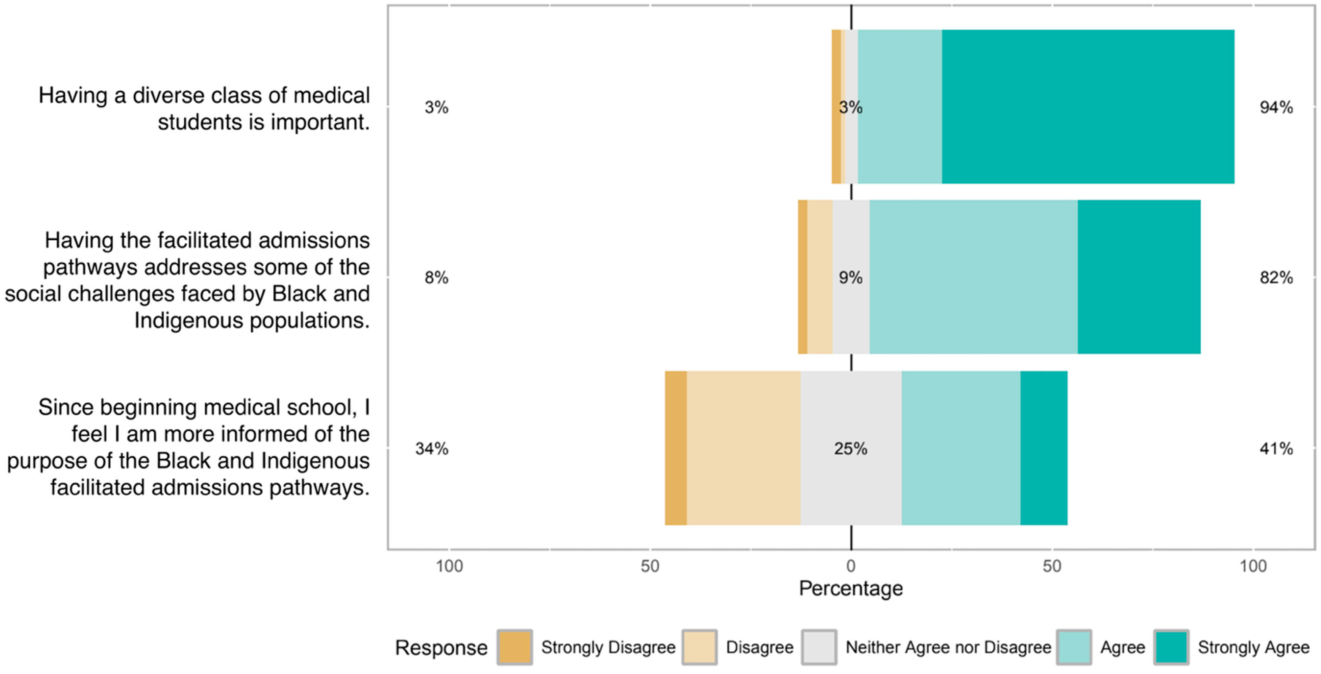Overall responses to the Likert-scale items are summarized in Figure 1, Figure 2, Figure 3, Figure 4 and Figure 5. Across items, most students agreed or strongly agreed that diversity in medicine is important and that Black and Indigenous admissions pathways help reduce barriers for applicants from these groups (Figure 1 and Figure 2). In contrast, responses were more mixed for items addressing transparency, fairness, and understanding of how the pathways operate, with a substantial minority reporting neutral or disagreeing responses (Figure 3, Figure 4 and Figure 5). Taken together, these patterns suggest broad support for the goals of equity-focused admissions alongside ongoing uncertainty and concern about their implementation and communication.