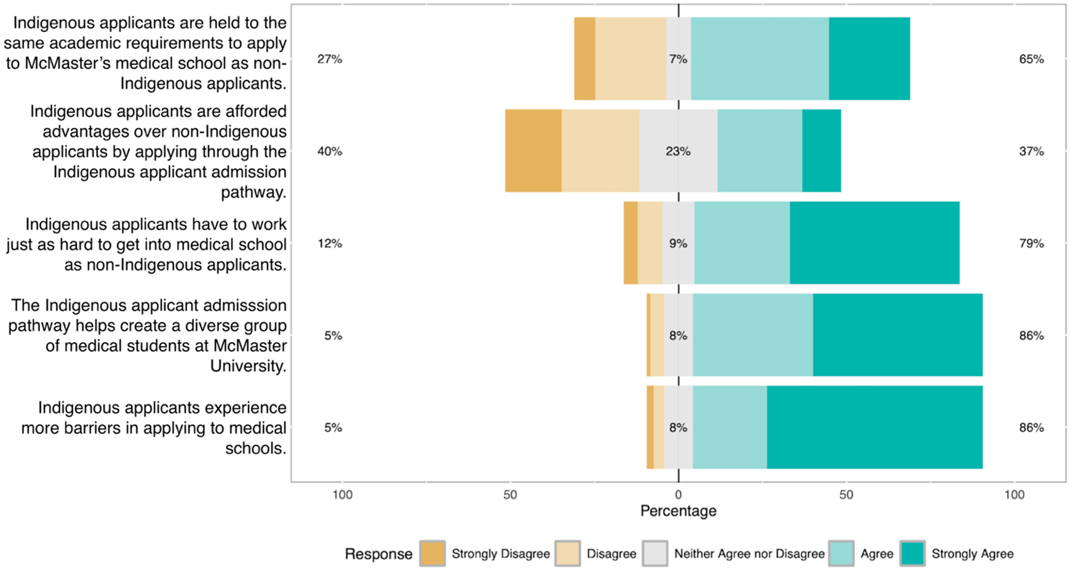 Prior to this study, medical students’ perceptions of Black and Indigenous admissions pathways remained unexplored. This gap is notable given evidence that stakeholder perceptions play a central role in shaping institutional culture and the long-term effectiveness of equity-oriented reforms in higher education. There is limited understanding of how medical students’ educational backgrounds, particularly those with interdisciplinary coursework, influence their perceptions of medical admissions pathways. This study sought to address this gap by exploring these relationships in McMaster University’s medical students in the undergraduate medical education (UGME) program. Our primary objective was to determine the perceptions that current medical students have about Black and Indigenous medical school admissions pathways at McMaster University. Secondary objectives were (i) to examine whether interdisciplinary post-secondary training (e.g., coursework outside biomedical sciences) is associated with perceptions of equity admissions and (ii) to explore whether educational background relates to attitudes toward Indigenous and Black peoples.
