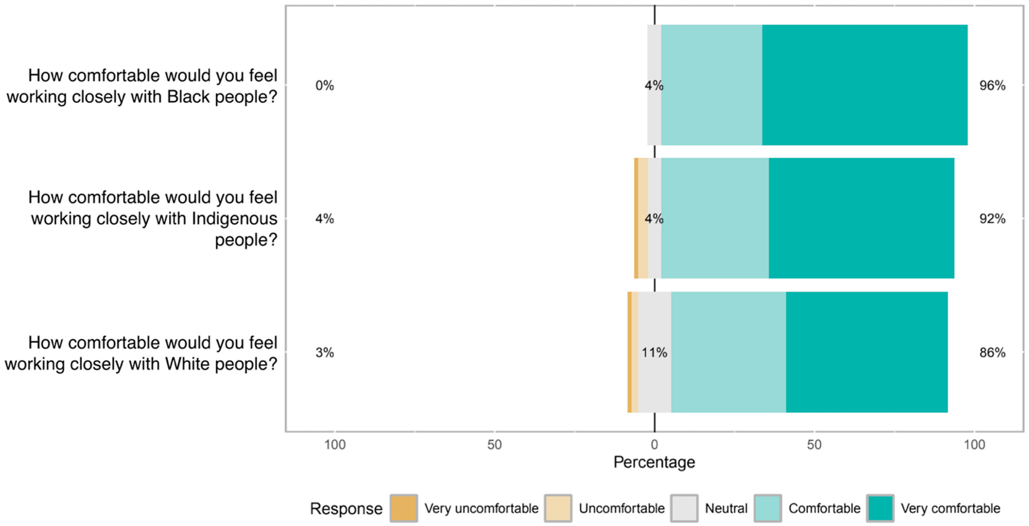 Figure 4. Likert-scale responses (n = 95) of level of agreement with statements regarding comfort working closely with Black, Indigenous, and White people.