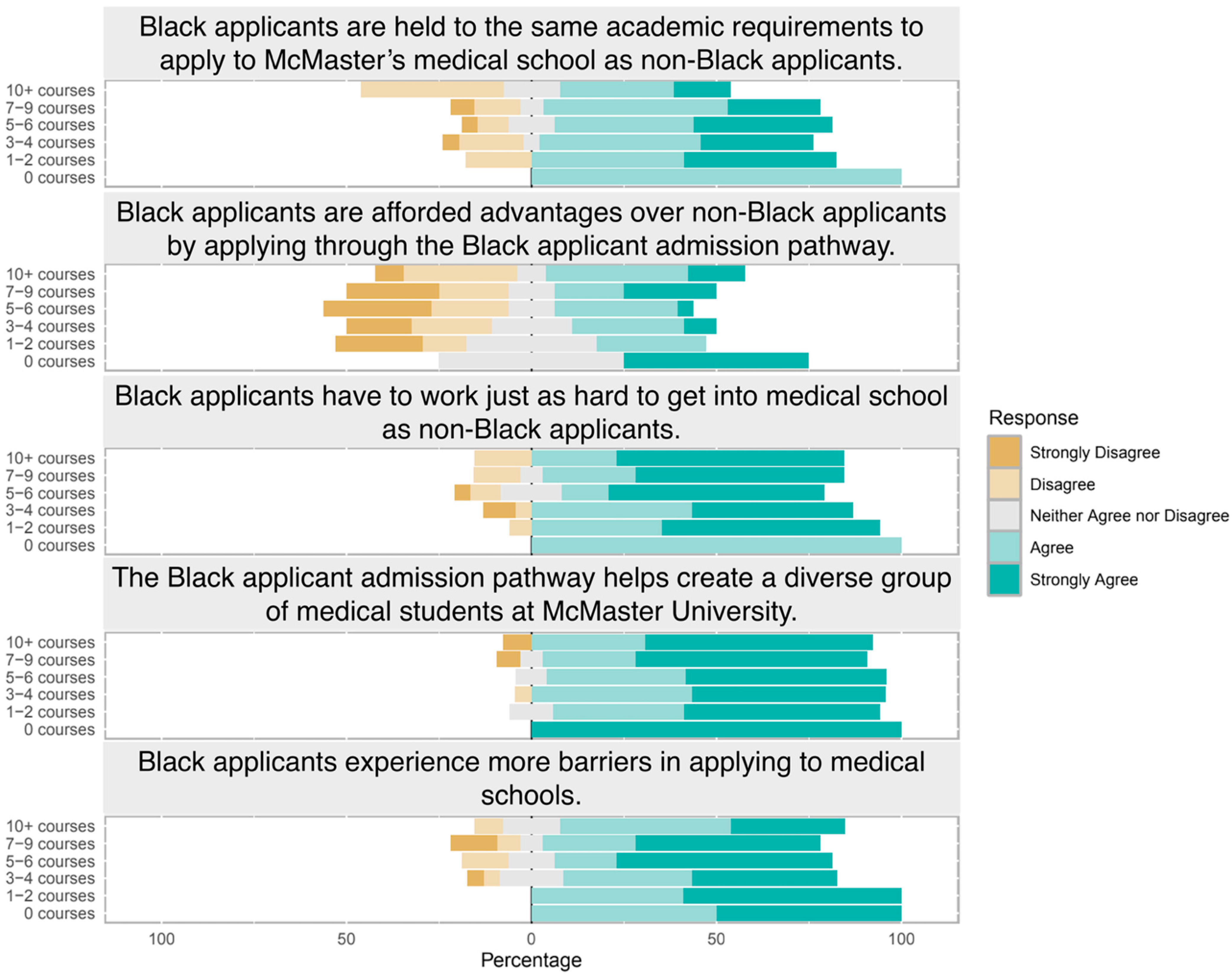 Based on our findings, we would be interested in creating orientation sessions for new medical students that contain information about the purpose and implementation of the facilitated admissions pathways. We would also consider developing modules for incoming medical students that cover topics such as the history of Black and Indigenous people in Canada, present-day challenges for these groups, and associations between healthcare and socioeconomic status. Future research should extend this work across multiple institutions to examine whether similar patterns of perception emerge in different medical school contexts and admissions models. Studies employing more nuanced operationalizations of educational background, including exposure to equity-focused curricula or qualitative exploration of formative educational experiences, may further clarify how training shapes attitudes toward equity-oriented admissions. Additionally, comparative work across professional programs and national contexts may help distinguish institution-specific concerns from broader dynamics inherent to selective admissions systems.