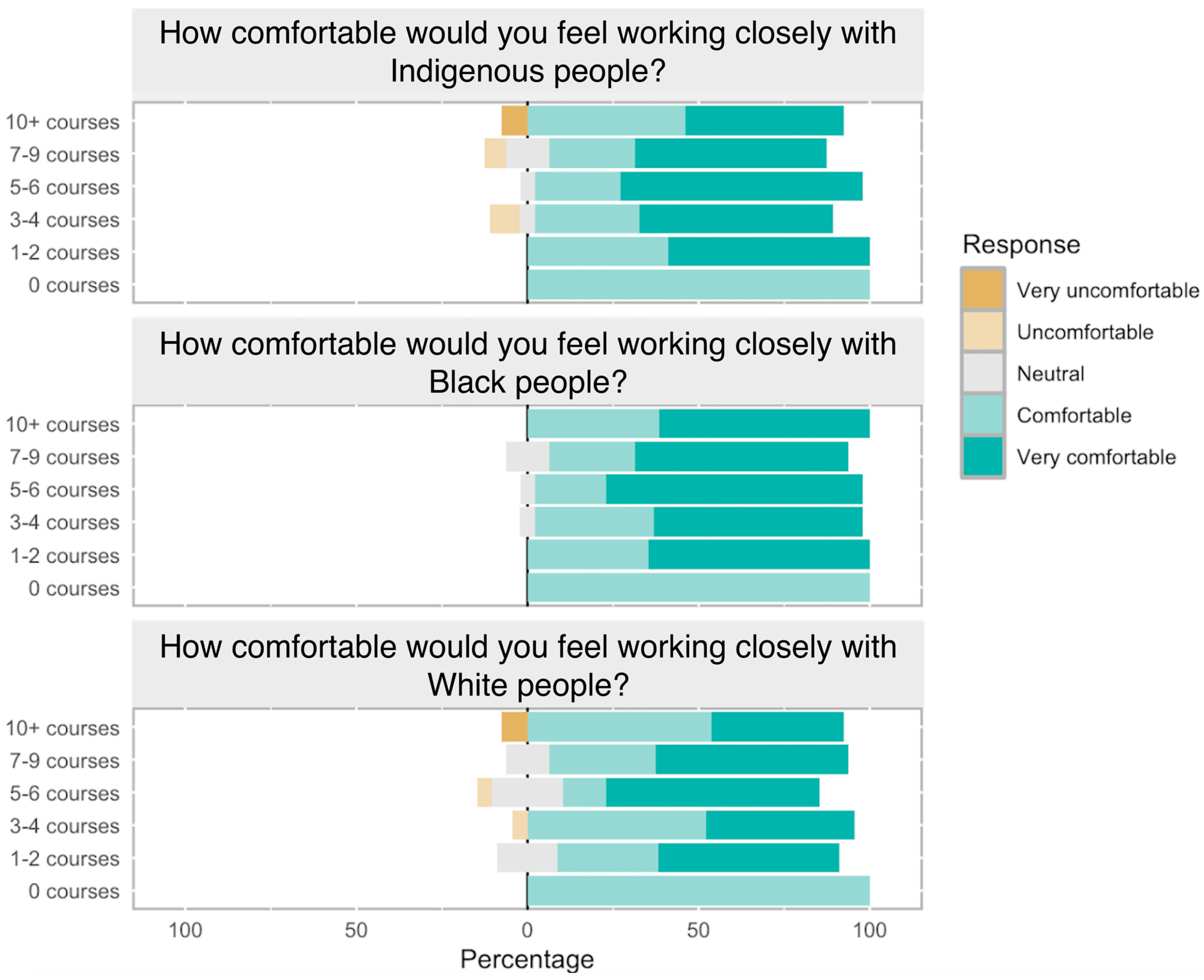 Figure 9. Likert-scale responses (n = 95) of level of agreement with statements regarding comfort working closely with Black, Indigenous, and White people, stratified by educational background.