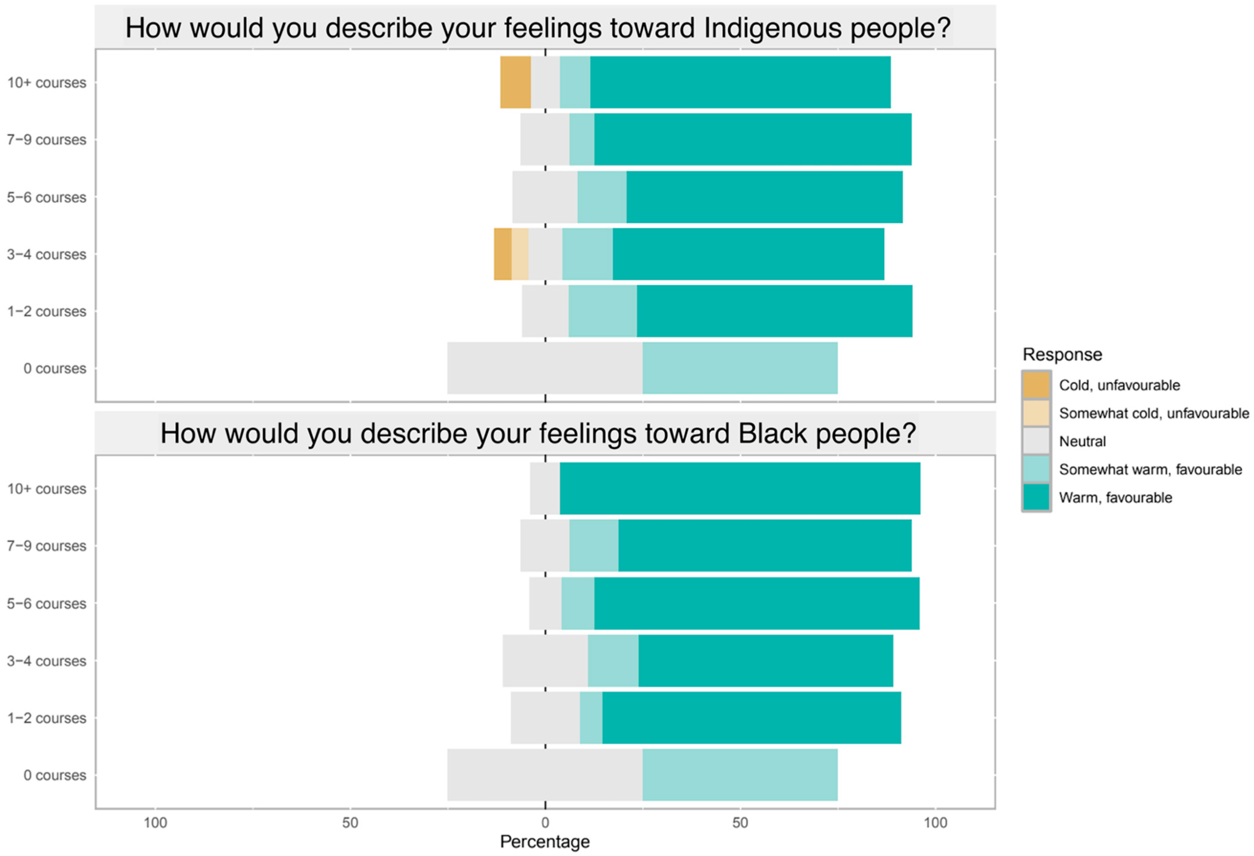 Our secondary research question examined whether an interdisciplinary postsecondary education influences perceptions of Black and Indigenous admissions pathways, and attitudes toward Black and Indigenous communities. Two participants described their feelings toward Indigenous people as “cold, unfavourable”; one had completed more than 10 and 3–4 humanities/social science courses, respectively. While outliers, these responses echo existing research suggesting that higher education does not necessarily predict more progressive attitudes toward marginalized groups [13,21]. This finding suggests educational background alone may not be the primary driver of negative perceptions, underscoring the need for further research.