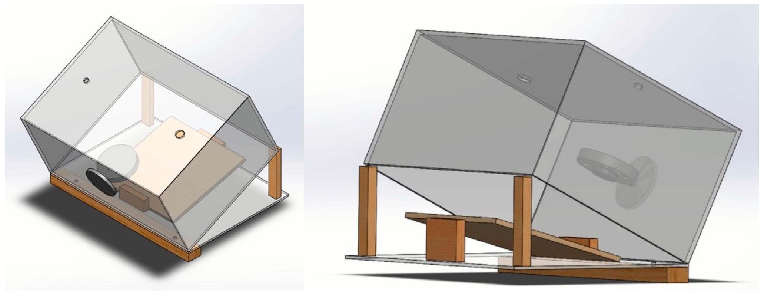 The simulation box was positioned on the plywood columns (in the rear corners of the container lid) and fixed in the back at an angle of 45 degrees. In this way, the difference in inclination angles between the camera (45 degrees) and the simulation pad (15 degrees) produced a 30-degree camera viewing angle. The simulator box and the base were fixed at the front with a wooden parallelepiped, long as the lower side of the base (280 mm), using wood screws positioned from top to bottom.