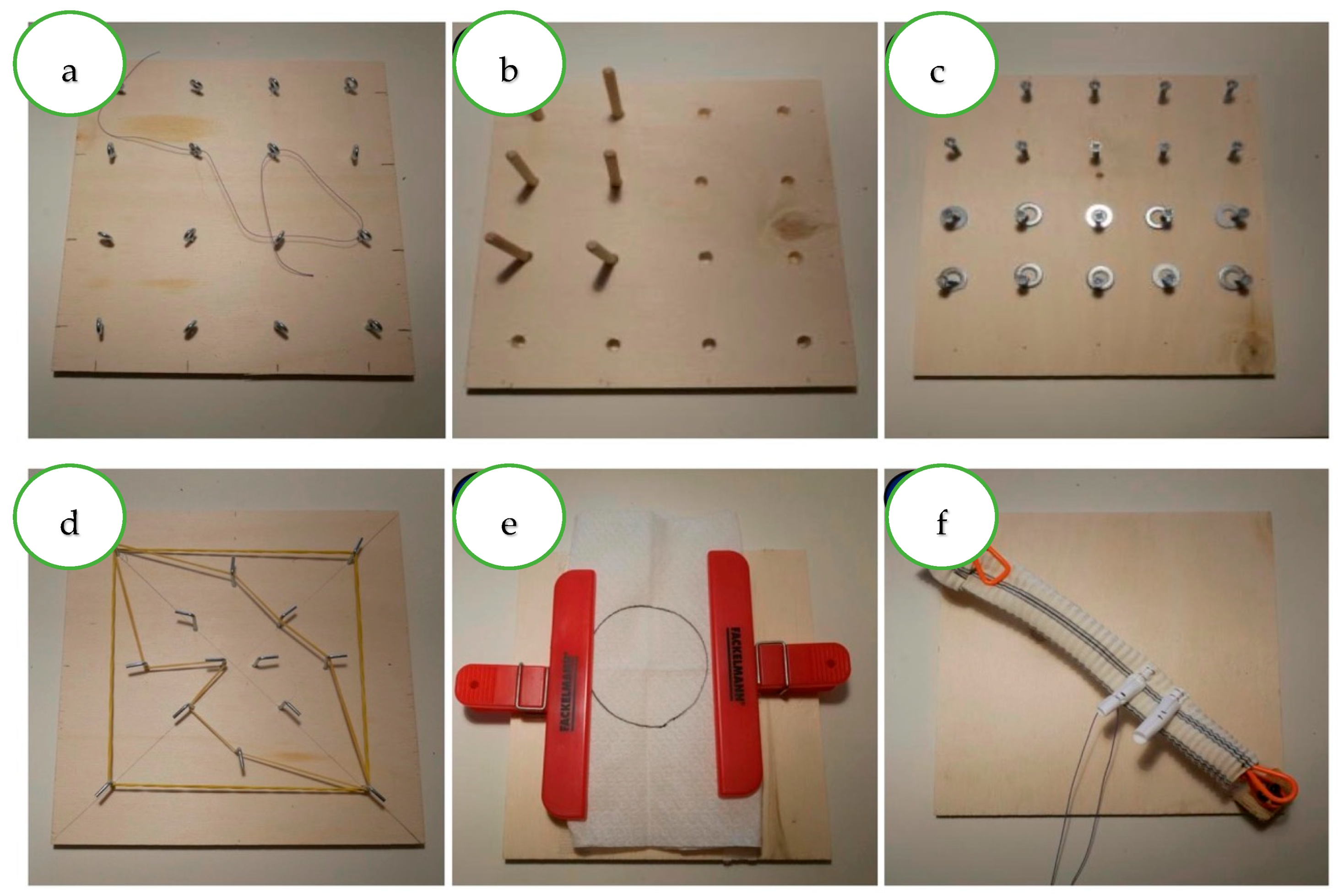 Figure 3b,c): These pads aim to simulate the “peg transfer,” moving an object (wooden cylinders or rings) from one position to another using both left and right hands; the exercise is then repeated in the reverse direction.