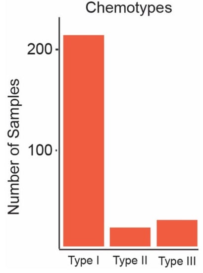 Chemotype distribution of evaluated cannabis inflorescence. n = 278 samples were evaluated in this study. Most competition entries were high-THC Type I flowers with less than 0.5% CBD (n = 215). There were n = 28 Type II and n = 35 Type III samples.