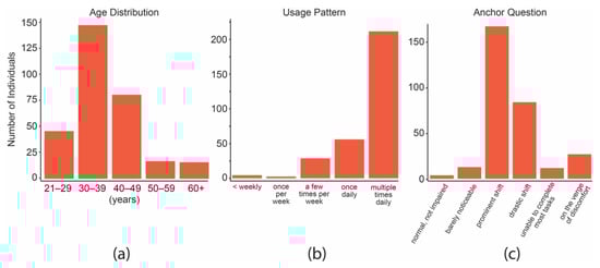 Volunteer characteristics. (a) Age distribution of volunteers: most individuals who completed anonymous surveys were aged 30–39. The overall age distribution reflected the Portland metropolitan area, according to US Census data. (b) Cannabis use patterns: prior to volunteering to judge samples at the competition, most individuals used cannabis multiple times per day. (c) Expectancy characteristics: When asked about their preference for the intensity of cannabis’ effects (“What do you typically consider a “good” or desirable effect from cannabis consumption?”), most volunteers reported a preference for a “prominent shift in perception.”