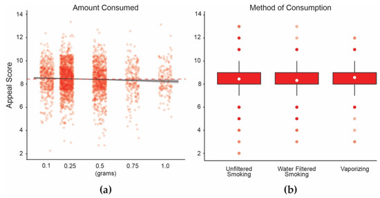 Cannabis consumption and subjective appeal. (a) Subjective appeal based on amount of cannabis consumed: Volunteers were given a visual reference guide to estimate the amount of cannabis they consumed in a single session (adapted with permission from DFAQ-CU, [49]). The most commonly reported amount of cannabis consumed in a single session was 0.25 g (44.6% of all sessions). There was a moderate but significant negative correlation between the amount of cannabis consumed and subjective appeal (black line, p = 0.021). (b) Subjective appeal based on consumption method: GEE modeling revealed a significant effect of consumption method on appeal (p = 0.026); however, mean appeal scores were very similar for unfiltered smoking, water-filtered smoking, and vaporizing (8.45, 8.33, and 8.58 respectively). Tukey’s post-hoc analysis revealed a significant difference between water-filtered and vaporized consumption methods: (p = 0.020).