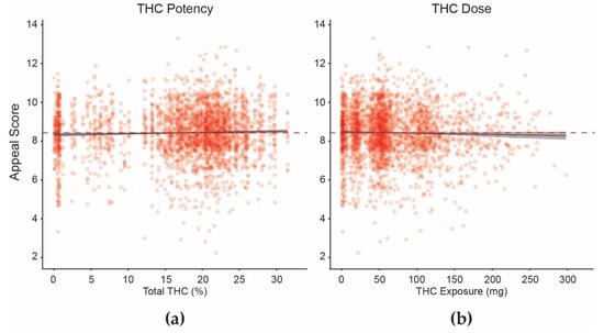 No relationship between THC and subjective appeal. (a) THC Potency: Subjective appeal was not associated with the THC potency of cannabis inflorescence samples. (b) THC Dose: The estimated maximal exposure to THC (amount consumed x THC potency) was also not associated with subjective appeal.