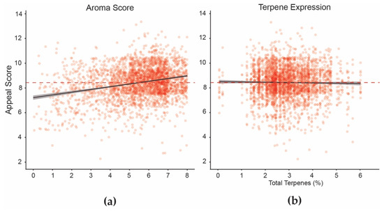 Aromatic features and subjective appeal. (a) Pleasant subjective aroma is correlated with subjective appeal: cannabis flowers with the most appealing aromas were the most likely to have the greatest subjective appeal (black line, p < 0.001). Visual jitter has been introduced in this figure so that the distribution of the data is clearer; however, statistics were performed on the raw data. (b) There was no relationship between terpenoid expression and appeal: terpene expression (total %) was not correlated with subjective appeal.