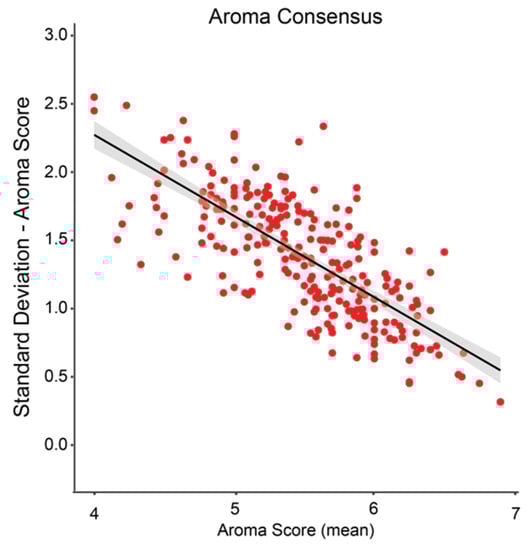 The strongest contribution to subjective appeal that we observed was pleasant subjective aroma (Figure 5a). That is, cannabis flowers with the most appealing aromas were the most likely to have the greatest subjective appeal (GEE, p < 0.001). Because terpenes and terpenoids are known to contribute to the aroma of cannabis, we also assessed the relationship between total terpene expression and subjective appeal. Similar to total THC potency, we found no association between total terpene expression and experiential appeal (GEE, p = 0.444, Figure 5b). Inflorescences with higher total terpene content were not more subjectively appealing. We also assessed the degree of interpersonal variability in the reported aroma scores. We found a significant negative relationship between a cultivar’s mean aroma score and the standard deviation of that aroma score (linear regression, p < 0.001). That is, there was a high degree of interpersonal consensus when a cultivar had a high aroma score, and low consensus when a cultivar had a low aroma score (Figure 6).