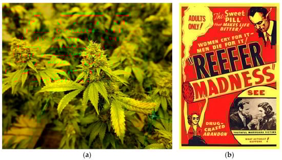 Cannabis plant and a 1930s film poster. (a) Mature cannabis plants. Reprinted from My 420 Tours (https://commons.wikimedia.org/wiki/File:Mature_cannabis_plant.jpg, accessed on 17 February 2023), https://creativecommons.org/licenses/by-sa/4.0/legalcode, accessed on 17 February 2023); (b) Poster for the 1936 propaganda film Reefer Madness exaggerating the dangers of marijuana []. This image is in the public domain.