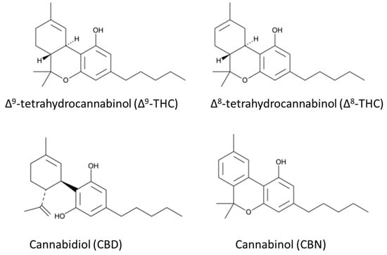 The pharmacological effects of cannabinoids are due to an affinity to two endogenous cannabinoid receptors, CB1, located in the central and peripheral neurons, and CB2, which is mostly found in the immune system []. Each cannabinoid receptor is important for the glutamate, dopamine and γ-GABA neurotransmitter pathways, and as a result, cannabinoids have sedative and stimulative properties depending on the dose. Low doses of Δ9-THC can result in relaxation and the impairment of short-term memory. At high doses, or with long-term use, panic, delirium and schizophrenia-like psychosis can occur [].