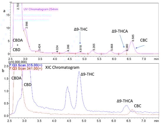 The LC/UV methods do not decarboxylate the cannabinoid analytes during the analysis. The sensitivity of the LC/UV methods in cannabinoid analysis is adequate, but there can be issues with coeluting the peaks. An example of this is shown in Figure 3a. The introduction of LC coupled with electrospray ionization mass spectrometry (LC-ESI-MS or LC-MS) in the 1990s increased the sensitivity of small molecules, such as cannabinoids, and it improved the ability to discriminate between coeluting the analytes by molecular weight in the chromatograms, which was not possible with LC/UV. The LC-MS techniques using extracted ion chromatograms (XIC) or selected ion monitoring (SIM) increase the selectivity. Figure 3b shows an XIC of cannabinoids extracted from a hemp flower. The CBD and CBDA peaks are coeluted on the UV chromatogram, but they have distinct chromatograms in LCMS with the XIC. The THCA and CBC peaks can also be analyzed as separate peaks in the XIC.