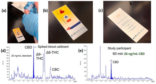 In an effort to demonstrate the feasibility of the DPS analysis, we and others have investigated the use of this method [,]. Figure 4a shows a single drop of blood collected from a finger prick and deposited onto a commercially available DPS card (Figure 4b) (Telimmune, West Lafayette, IN, USA). Figure 4c, the plasma spot card filters out the red blood cells leaving 3 µL of dried plasma on each circle, a process that takes about 3 min. The finger prick collection could be done on-site (accident scene, regulatory worksite setting, private school student drug testing, etc.) and then the card can be sent to a facility for analysis. Figure 4d,e shows the MRM chromatograms for a cannabinoid standard mixture along with an example chromatogram of a study participant who ingested CBD []. The analysis indicated that the concentration of CBD in the blood was 26 ng/mL, and there was no detectable amount of Δ9-THC, Δ8-THC and CBD.