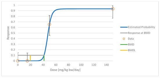 The eligible studies were assessed using the benchmark dose (BMD) approach according to the guidelines of the United States (US) Environmental Protection Agency (EPA) [11]. The BMD and its respective lower confidence interval, the BMDL, were calculated by fitting multiple statistical models using the benchmark dose v. 3.2.0.1 (rel. 2022-03-15) software (BMDS) [12] (US EPA, Washington, DC, USA), which performs automated fitting of selected models to dose–response data retrieved from toxicological studies. The most appropriate model was determined based on the Akaike information criteria generated in the output. All settings of the BMDS were at default.