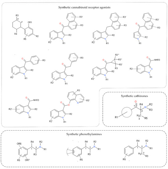 Generic classification structures of synthetic cannabinoid receptor agonists (SCRAs), synthetic cathinones, and synthetic phenethylamine groups.