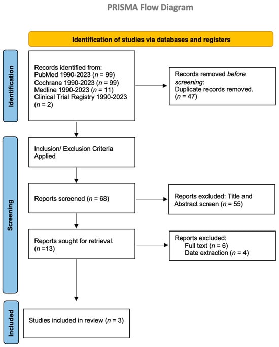 We retrieved a total of 68 articles from all the databases after removing duplicates, and two independent authors worked on it separately, and finally, this conclusion was reached. Any disagreement between the two authors regarding the inclusion or exclusion criteria of studies in this systematic review was resolved by in-depth discussion among authors and independently verified by another author. After applying our exclusion/inclusion criteria, we removed 55 articles based on title and abstract screening and 6 articles upon full-text screening. We could not find the full text for four articles, so they were removed during data extraction. In total, we retrieved three articles to include in our systematic review (
