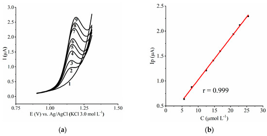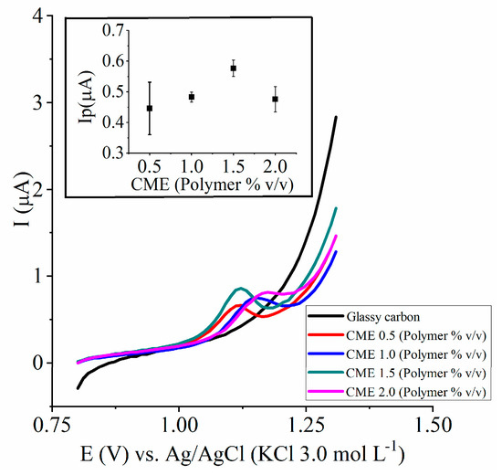 Under the experimental conditions, the potential range of the glassy carbon electrode without modification was up to 1.20 V; thereafter, the current increased progressively during voltammetry. The use of a CME allowed for a slightly larger potential window to be used, up to 1.30 V (Figure 1a).