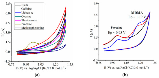 Procaine was the only species that presented an anodic peak at 0.95 V. However, MDMA can be detected without prejudice in the analysis, with it being possible to detect both species when they were present in the same matrix (Figure 5b).