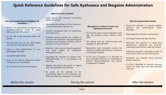 In the literature, two previous guidelines that address recommendations for the safe use of psychedelics in clinical research settings were identified [,]. However, one of them, published 15 years ago, does not specify the required actions during adverse scenarios with psychedelics in detail and is more focused on data from studies with LSD and psilocybin []. The other is more focused on clinical trials for the industry and also lacks detailed information on safety procedures in specific situations []. Specifically, in the case of ibogaine, there is a guideline to manage the risks of its use in the clinical setting []. Therefore, this guideline aims to update the data already published, in addition to developing specific recommendations, establishing protocols to manage serious adverse effects, and establishing standardized care regarding procedures and professional conduct for handling volunteers during experimental sessions involving the administration of ayahuasca and ibogaine. To achieve this objective, our team thoroughly crafted a series of recommendations, covering topics we consider relevant based on our decade of expertise in conducting clinical trials with psychedelic substances, especially focusing on the particularities of ayahuasca and ibogaine. The protocols follow a broader philosophy of modular, independent sets of guidelines constantly published and updated by the clinical staff of Hospital das Clínicas de Ribeirão Preto (the University of São Paulo’s affiliated teaching hospital). After deciding the main topics we sought to cover, drafts of the protocols were presented to the team and tested in live scenarios, undergoing several iterations in order to achieve a well-rounded version that is comprehensive and straightforward, ensuring the safety and the physical and psychological well-being of participants within the context of clinical research involving other psychedelic substances.