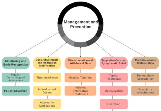 Psychotropic medications are invaluable tools in the treatment of psychiatric disorders, substantially improving the quality of life for countless individuals. Yet, the therapeutic benefits of these medications can be accompanied by potentially distressing, and, in some instances, severe dermatological side effects. Severe ACDRs such as SJS/TEN must be treated immediately because these are medical emergencies associated with significant mortality. The first step towards managing ACDRs is the identification and prompt withdrawal of the offending drug []. Discontinuing the causative drug often resolves cutaneous adverse effects, accounting for 93.7% of these reactions []. This decision should be made carefully, weighing the skin reaction’s severity against the underlying illness the medication was intended to treat []. A notable difficulty encountered in the context of ACDRs arising from psychotropic medications is where patients receive multiple drugs. Most ACDRs are not diagnosed as being caused by drugs. In such scenarios, the discontinuation of non-essential medications can be considered. For lithium and CBZ, reducing the dose can improve the skin condition. With CBZ, starting with lower doses and gradually increasing can prevent cutaneous eruptions. In cases of mild alopecia, continuation of the drug is generally preferred unless severe adverse effects occur []. Other treatments primarily focus on symptom management. Pruritus can be relieved with antihistamines, either topical or systemic. Lichenification responds to topical steroids, while severe exanthematous reactions may require systemic steroids. Hyperhidrosis can be managed by adjusting the dose, switching drugs, or discontinuing the medication []. Topical aluminium chloride hexahydrate can help in mild cases. If these options are unsuitable, medications like glycopyrrolate, benztropine, terazosin, mirtazapine, cyproheptadine, or clonidine may be considered, considering comorbidities like glaucoma and dementia [].