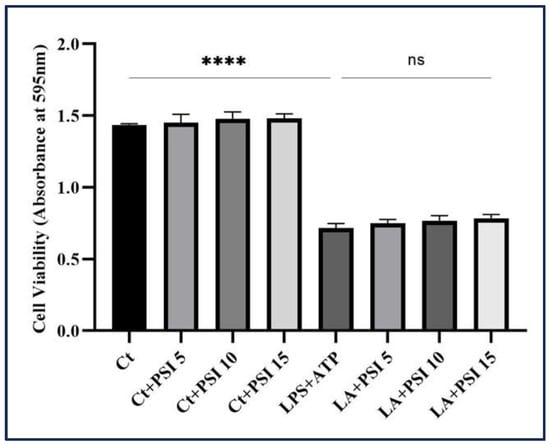 The effect of psilocybin on the survival of THP-1 macrophage cells treated with LA. The MTT assay was performed to measure the impact of psilocybin on LA-induced THP-1 cell viability. Administering various concentrations of psilocybin to macrophages induced by LPS and ATP did not negatively impact the viability of the cells. The presented data represent the mean values (with standard deviation, SD), n = 3. Figure abbreviations include Ct (control), PSI (psilocybin), and LA (LPS + ATP). Asterisks denote significant differences, where four—p < 0.0001; ns—non-significant.