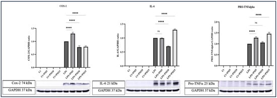 Western blot analysis of Cox-2, IL-6, and Pro-TNFα in response to psilocybin. Whole cellular lysates prepared from LPS-induced and uninduced THP-1 macrophages were subjected to western blot analysis using antibodies to IL-6, Pro-TNFα, and Cox2; GAPDH served as a loading control. Relative densitometry was measured using ImageJ. All data are presented as mean values ± SD, n = 3 measurements. The abbreviations are: Ct (control), PSI (psilocybin). Asterisks indicate significant differences, where 4 asterisks denote a p-value < 0.0001, while “ns” denotes non-significance. The whole western blots were showed in the supplementary materials.