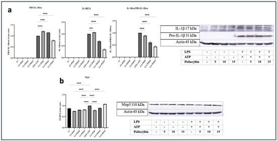 Cells treated with LPS underwent incubation with 5 mM adenosine 5′-triphosphate (ATP) disodium salt hydrate (product ID: A6419, sourced from EMD Millipore Corporation, Temecula, CA, USA) for 30 min to initiate the assembly of the NLRP3 inflammasome. It is essential to mention that, for the preparation of the ATP stock, the powder was dissolved in the medium, and the pH was adjusted to 7 using NaOH, followed by filtration of the stock, and storage at −20 °C. In this study, we examined the effects of three different doses of psilocybin on both LPS-stimulated and unstimulated THP-1 macrophages. The objective was to understand the impact of psilocybin on general inflammatory responses and also on LPS-mediated inflammatory responses in THP-1 macrophages. To ensure that psilocybin’s activity does not interfere with LPS induction, we pre-treated the cells with psilocybin before the induction with LPS. It is important to highlight that we conducted optimization studies to determine the optimal dose of LPS and the duration of LPS and ATP incubation. Moreover, as extracellular ATP levels primarily contribute to the formation of the NLRP3 inflammasome, we studied the response of NLRP3, Pro-IL-1β, and IL-1β to psilocybin in LPS + ATP (LA)-induced THP-1 macrophages, whereas for other proteins and gene expression studies, we used LPS-induced THP-1 macrophages.