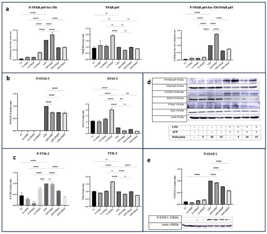 The impact of psilocybin on P-NF-kB P65 (Ser536), total-NF-kB P65, P-STAT3, total-STAT3, P-TYK2, total-TYK2, and P-STAT1 in THP-1 macrophages at protein level. (a) The impact of three doses of psilocybin on the levels of P-NF-κB P65 (Ser536), total-NF-kB P65, and P-NF-κB P65 (Ser536)/NF-κB P65 in both LPS-induced and uninduced THP-1 macrophages. (b) Psilocybin’s impact on the expression of P-STAT3 and total-STAT3 at protein level in THP-1 macrophages stimulated by LPS. (c) Psilocybin’s effect on the responses of P-TYK2 and TYK2 proteins in LPS-challenged THP-1 macrophages. (d) Levels of P-NF-kB P65, total-NF-kB P65, P-STAT3, total-STAT3, P-TYK2, total-TYK2, and actin proteins in the western blot images. (e) The impact of three doses of psilocybin on the response of P-STAT1 in LPS-stimulated THP-1 macrophages. As a loading control, β-actin was employed, and ImageJ was utilized to measure relative densitometry. All data are expressed as mean values with the standard deviation (±SD) based on three measurements (n = 3). Abbreviations: Ct (control), PSI (psilocybin). Asterisks denote the significance levels: one indicates p < 0.05; two mean p < 0.01; three shows p < 0.001; four indicate p < 0.0001; ns means non-significant. supplementary materials.