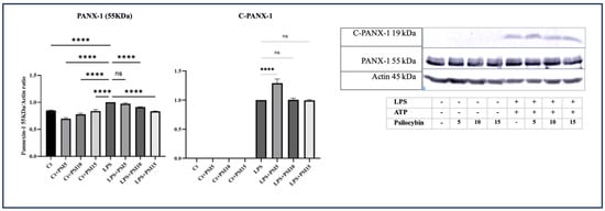In our study, we observed that psilocybin does not show an inhibitory effect on the cleavage of PANX-1 in macrophages challenged by LPS (Figure 5). However, it exhibited a negative impact on the overall level of total PANX-1 protein in LPS-induced THP-1 macrophages (Figure 5).