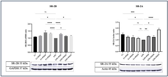 Psilocybin exhibits a strong binding affinity for serotonin receptors 2A (SR-2A) and 2B (SR-2B). These receptors, which belong to the larger family of serotonin receptors, play significant roles in a wide range of physiological and psychological processes [24]. Our findings demonstrate that the exposure to LPS reduces the levels of both SR-2A and SR-2B in LPS-induced THP-1 macrophages. Addition of psilocybin changed the levels of both receptors (Figure 6).