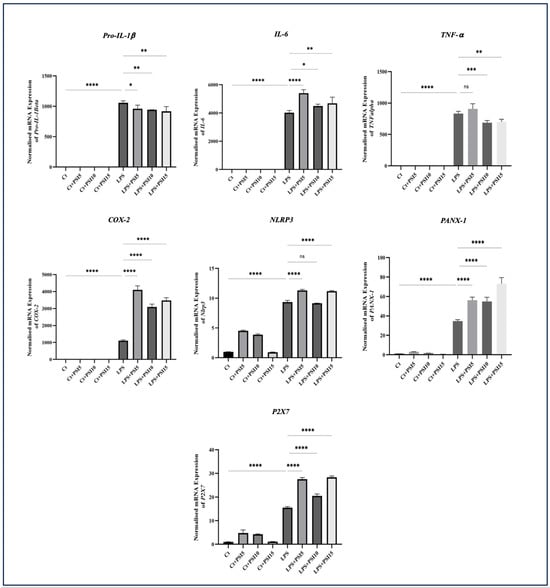 The impact of psilocybin on the expression profiles of Pro-IL-1β, IL-6, TNFα, Cox-2, Nlrp3, PANX-1, and P2X7 genes in THP-1 cells. THP-1 macrophages were treated with psilocybin for 1 h, followed by the stimulation of the cells with LPS for the next 4 h. Subsequently, total RNA was extracted from the cells and subjected to qPCR analysis. The data are represented as mean values accompanied by the standard deviation (±SD), calculated from a sample size of N = 3, normalized against GAPDH mRNA. Abbreviations: Ct (control), PSI (psilocybin). The asterisks show significant difference, one—p < 0.05; two—p < 0.01; three—p < 0.001; four—p < 0.0001; ns—non-significant.