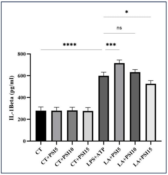 ELISA analysis of secreted IL-1β in LA-challenged THP-1 macrophages in response to psilocybin. ELISA was conducted to determine the impact of psilocybin on IL-1β release. The data are expressed as mean values with the standard deviation (±SD) based on three measurements (N = 3). Abbreviations: Ct (control), PSI (psilocybin), and LA (LPS + ATP). The asterisks denote significant difference, where one indicates p < 0.05; three show p < 0.001; four mean p < 0.0001; ns indicates non-significant.