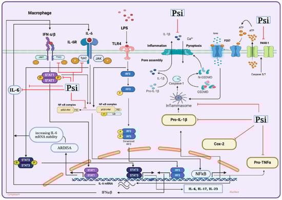 The effects of 10 μM psilocybin on inflammatory responses in LPS/LA-induced THP-1 macrophages. The dose of 10 μM psilocybin decreases the concentrations of proinflammatory proteins, including Pro-IL-1β, COX-2, IL-6, NLRP3, and PANX-1. Additionally, the administration of 10 μM psilocybin inhibits the activities of NF-κB, TYK2, STAT3, and STAT1, downregulating Pro-IL-1β as well as Pro-TNFα. The reduction of IL-6/P-TYK2 could play a crucial role in the inhibitory effect of psilocybin on the activation of NF-κB, STAT1, and STAT3. This finding strongly supports the potential of psilocybin to inhibit cytokine storms. Notably, the downregulation of PANX-1 protein by 10 μM psilocybin in LPS-induced macrophages may play a crucial role in suppressing the assembly of NLRP3 inflammasome, Pro-Caspase-1 cleavage into active Caspase-1, and the subsequent synthesis of active IL-1β.